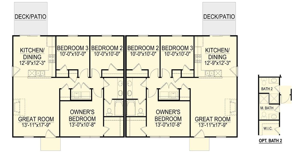 This modest duplex unit derives from a 1054sq.ft. efficient starter ranch plan. These units offer an open great room and dining/kitchen that is perfect for family interaction. The owner bedrooms offer a sizable walk-in closet and each units divided bath provides privacy and the "effect" of two baths.