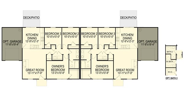 This duplex unit contains two 1054sq.ft. units creating an efficient starter ranch plan. These units offer an open great room and dining/kitchen that is perfect for family interaction. The owner bedrooms offer sizable walk-in closet and each unit's divided bath provides privacy and the "effect" of two baths. Specify the Two Bath option and the Owner's Bedroom has a private bath. This plan's flexibility includes a single-car garage that makes this a workable plan for the owner as well as the builder.